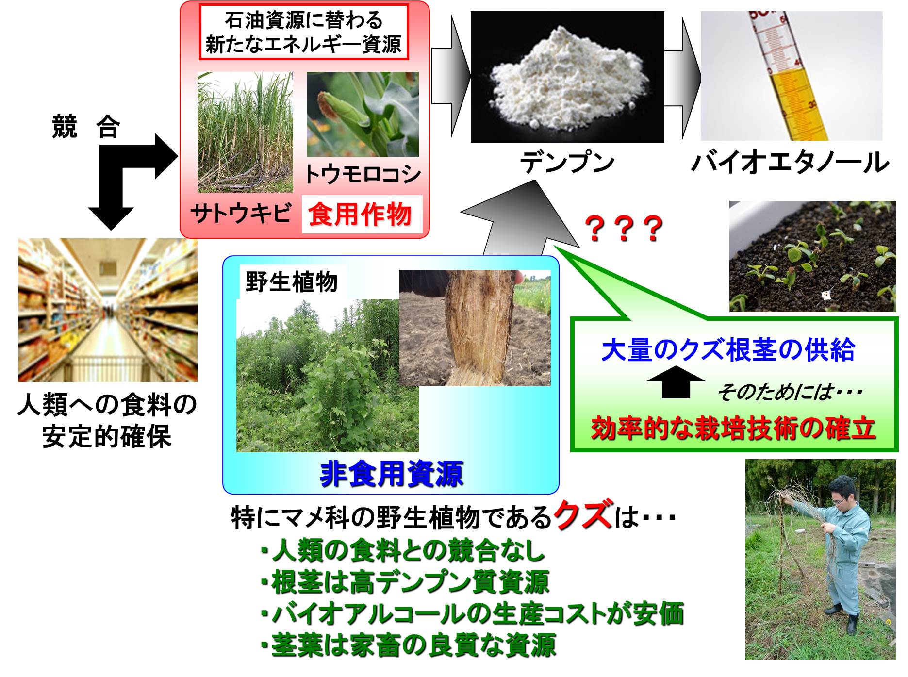 また,植物を利用したバイオエタノールに関する研究が世界的にも注目されていますが,現在のバイオエタノール生産に利用される植物は,トウモロコシあるいはサトウキビ等の食用資源であるため,人類の食料との競合が問題となります。これに対して,野生植物を利用することは人類の食料と競合せずに大量にバイオエタノール生産を行うことが可能になります。この研究室では,このような次世代エネルギーに変換できる作物の栽培技術の確立について研究を進めています。