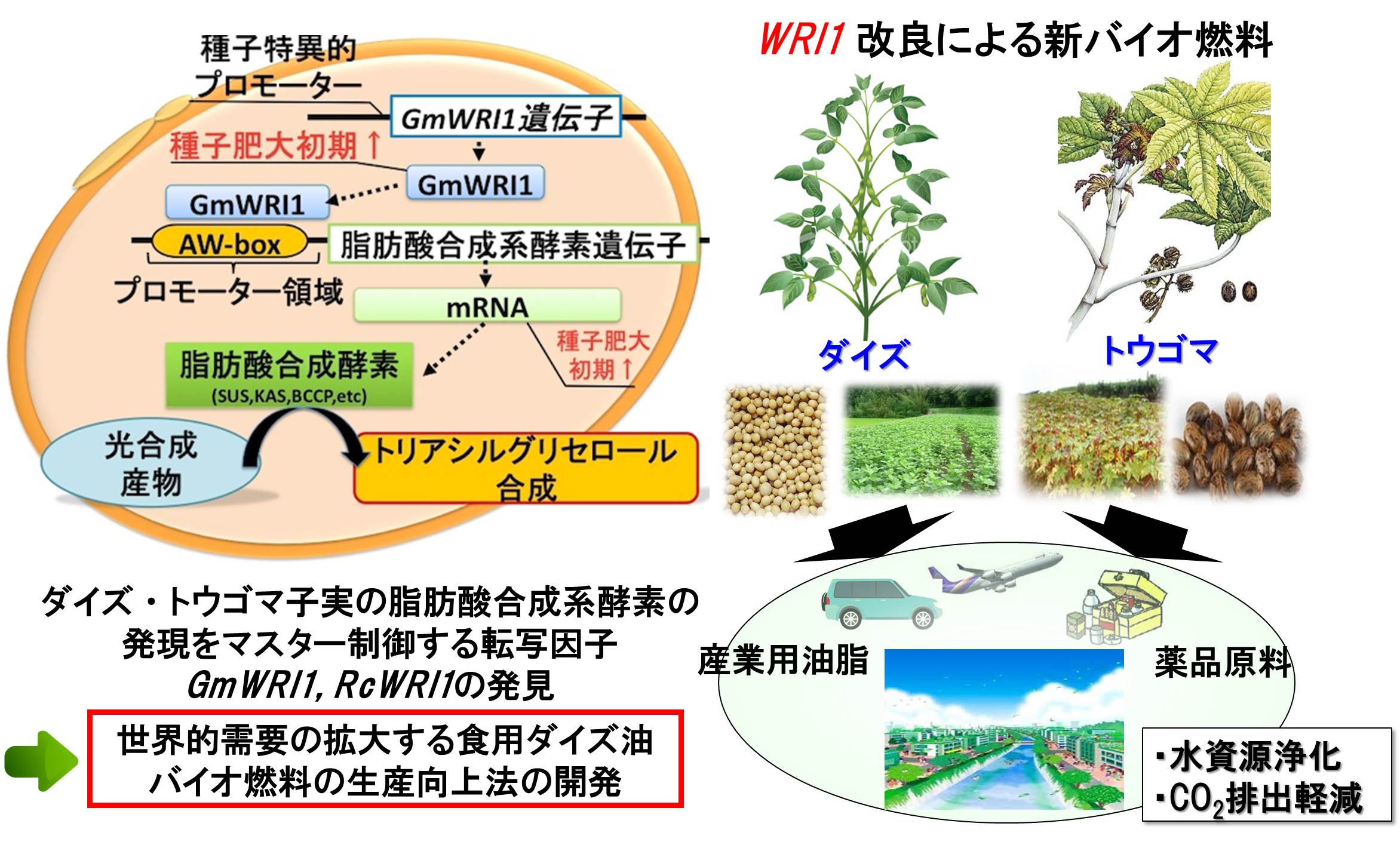 ダイズの子実には脂質,タンパク質やデンプンが含まれていますが,油脂含有量(約20%)の向上やトランス脂肪酸の低減など,高付加価値のあるダイズ品種の育成が急務となっています。また,トウゴマ(トウダイグサ科)の子実には非常に高い粘性を持つ脂肪酸(シノール酸)を約90%含み,高品質の潤滑油の原料に利用されています。このように,ダイズやトウゴマの子実には油脂を多く含みますが,そのメカニズムは遺伝子が関係していることが明らかとなりました。したがって,この遺伝子を利用して油脂生産量を増大させることのできるダイズやトウゴマの分子育種や栽培方法の解明について研究を進めています。
